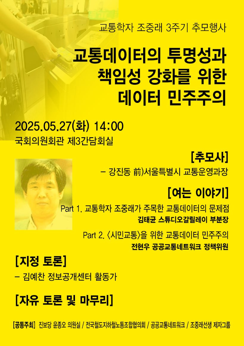 2. 선생의 제자들과, 선생의 교통정책의 민주주의에 대해 깊이 공감했던 공공교통교통네트워크는, 오는 27일 국회에서 추모좌담회를 개최합니다. 이 자리는 진보당 윤종오 의원실과 궤도협의회가 공동으로 주최합니다.
