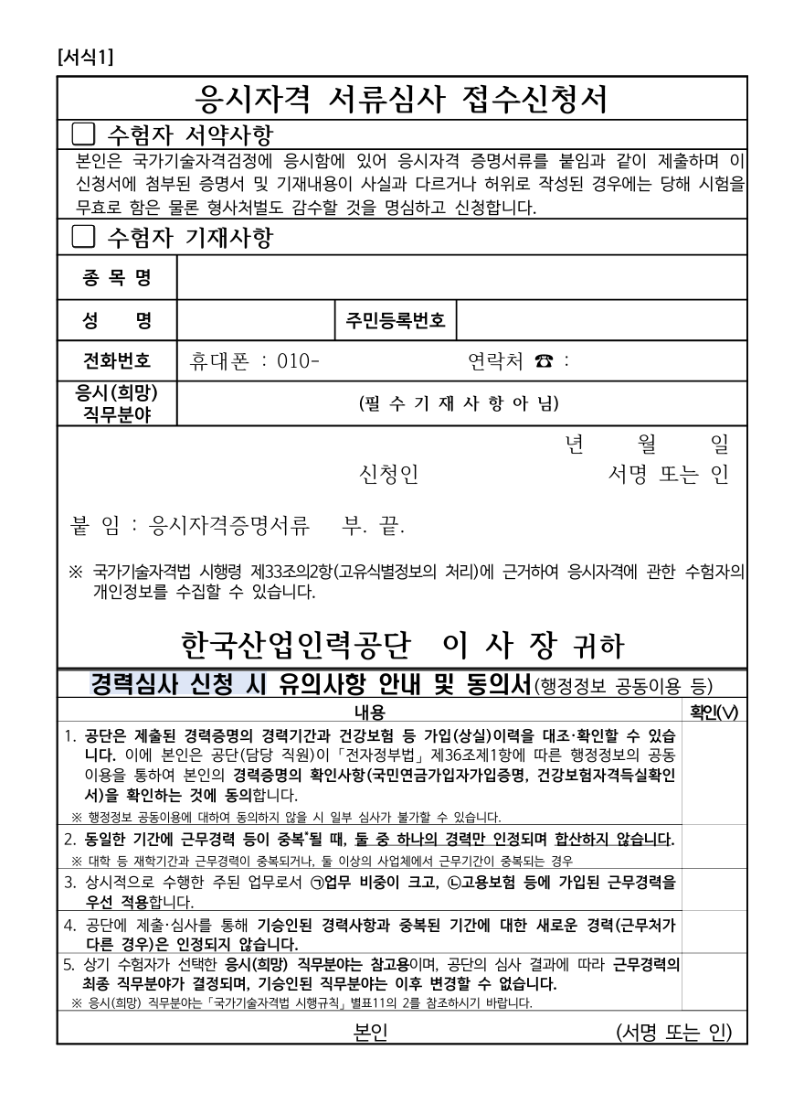 국가기술자격 응시자격 서류심사 접수신청서 작성자진솔|작성시간25.11.22|조회수41 목록 댓글 0 글자크기 작게가 글자크기 크게가 응시자격 서류심사 접수신청서.pdf101.84KB국가자격검정 인정신분증 범위 알림.pdf173.33KB(붙임1) 국가기술자격시험 활용 가능 계산기 안내문.pdf74.31KB 첨부파일첨부된 파일이 4개 있습니다. png 파일 image.png 다운로드 pdf 파일 응시자격 서류심사 접수신청서.pdf 다운로드 pdf 파일 (붙임1) 국가기술자격시험 활용 가능 계산기 안내문.pdf 다운로드 pdf 파일 국가자격검정 인정신분증 범위 알림.pdf 다운로드 다음검색 현재 게시글 추가 기능 열기 북마크 공유하기 신고 센터로 신고 댓글 댓글 0 댓글쓰기 답글쓰기 댓글 리스트