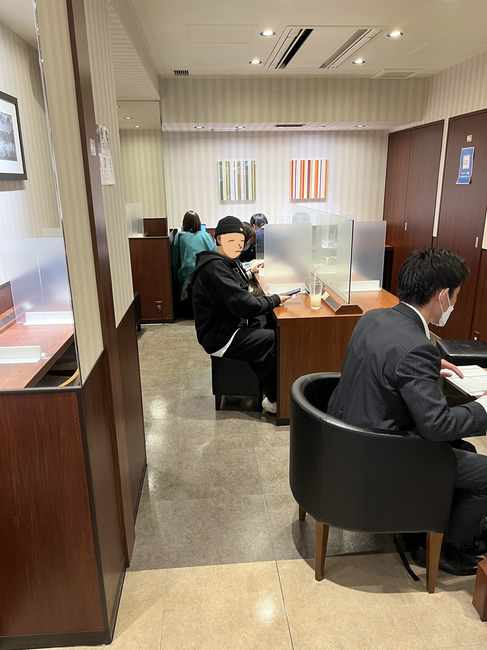 마주보고 칸막이 설치 된 채로 서로 폰만 하다가