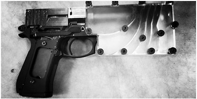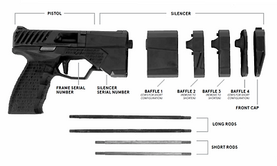 소음기 부분은 크게 총몸과 4개의 베플, 그리고 프론트캡으로 구성된다. 엄청난 열과 피로에 버티기 위하여 재질로는 7075-T6 알루미늄을 채택하였다. 총열의 길이는 4인치로 권총으로서 기대할 수 있는 정확성은 충분히 충족한다. 필요에 따라 소음기의 베플 숫자를 줄여 총 전체의 길이를 짧게 만들 수도 있다. 이 경우에는 전체 길이가 27cm에서 24cm로 줄어드는 장점이 있지만, 당연히도 소음이 140dB에 약간 못미치는 정도여서 소음효과는 줄어들 수 밖에 없다.