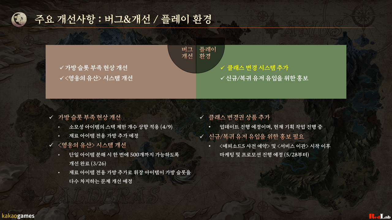 지난 <PD 브리핑>에서 말씀드렸던 것처럼, 저희 개발팀은 현재 6월 진행될 <에피소드5: 다크 렐름> 업데이트를 준비 중이며, 이에 앞서 <롬>의 라이브 서비스 2년 동안 축적된 시스템과 컨텐츠를 개선하고 심화하는 작업을 4월과 5월에 진행할 예정입니다.