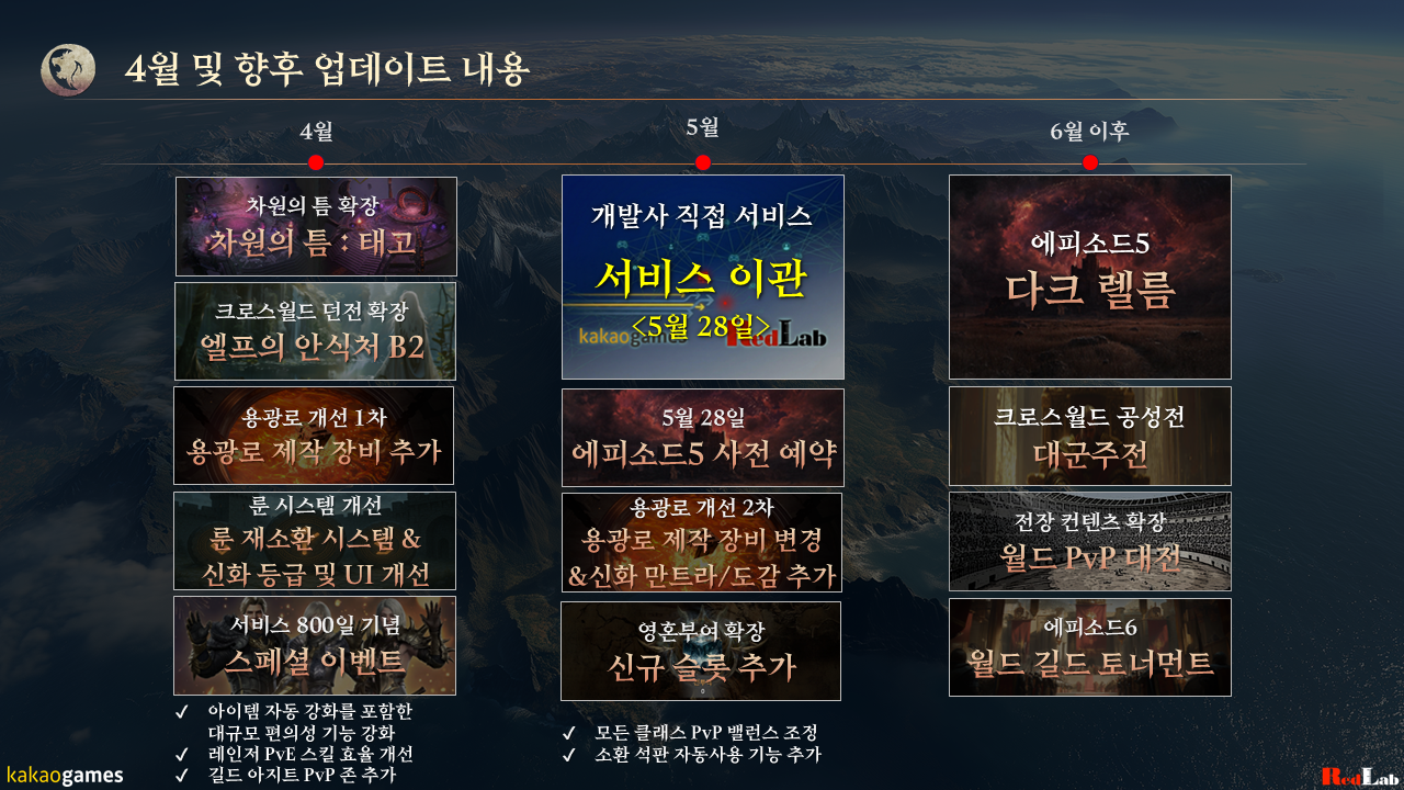 5월에는 <용광로 개선 2차> 업데이트로 신화 만트라 추가 및 기존 만트라 +6, +7강화 도감 추가와 함께 <용광로> 보상 아이템으로 제작 가능한 신화 등급 장비 교체를 준비하고 있으며, <영혼부여> 신규 슬롯 추가 및 모든 클래스 PvP 밸런스 조정, 소환 석판 자동사용 기능 업데이트를 준비하고 있습니다. 그리고 5월 28일부터 <서비스 이관>이 시작되고, 간단한 이관 절차 이후 <레드랩게임즈>가 직접 서비스하는 <롬>을 계속 플레이할 수 있습니다. 또한, <에피소드5 사전 예약>도 5월 28일부터 시작됩니다.