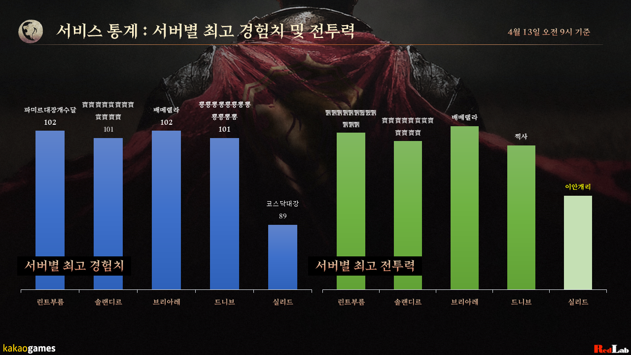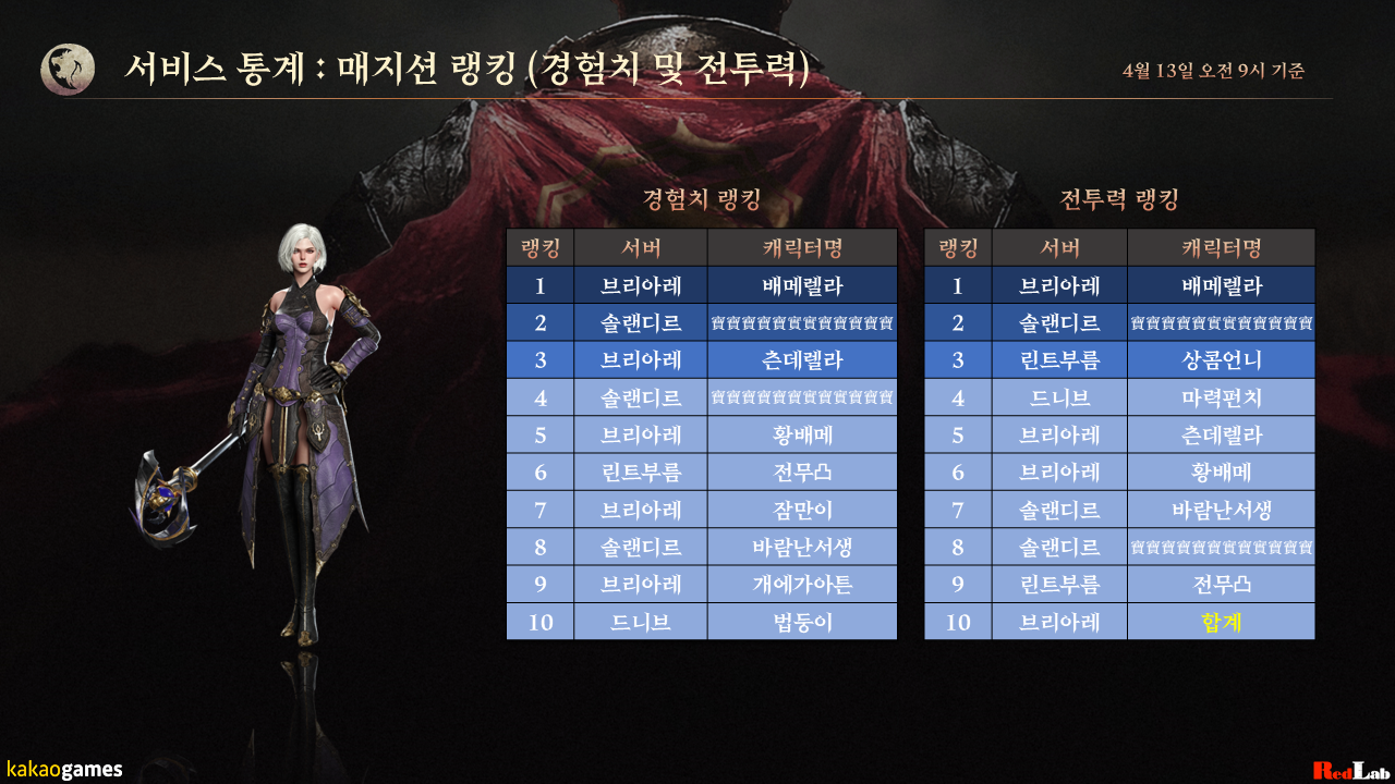 4월 13일(통계 집계일) 오전 9시 기준, 모험가님들의 서비스 통계 데이터입니다.