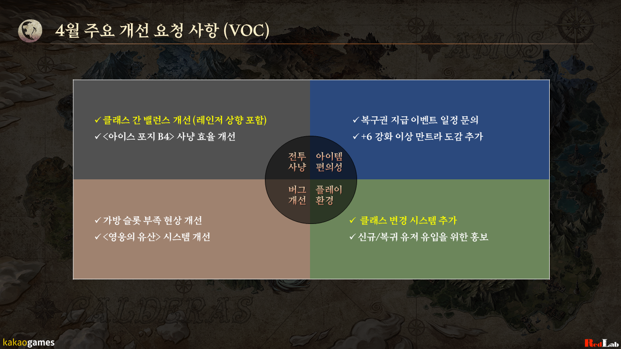 레인저 상향 의견을 포함한 클래스 간 밸런스 개선, <아이스 포지 B4> 사냥 효율 개선, 복구권 지급 이벤트 일정 문의, 가방 슬롯 부족 현상 개선, 클래스 변경권 상품 추가 등의 의견을 보내주셨습니다.