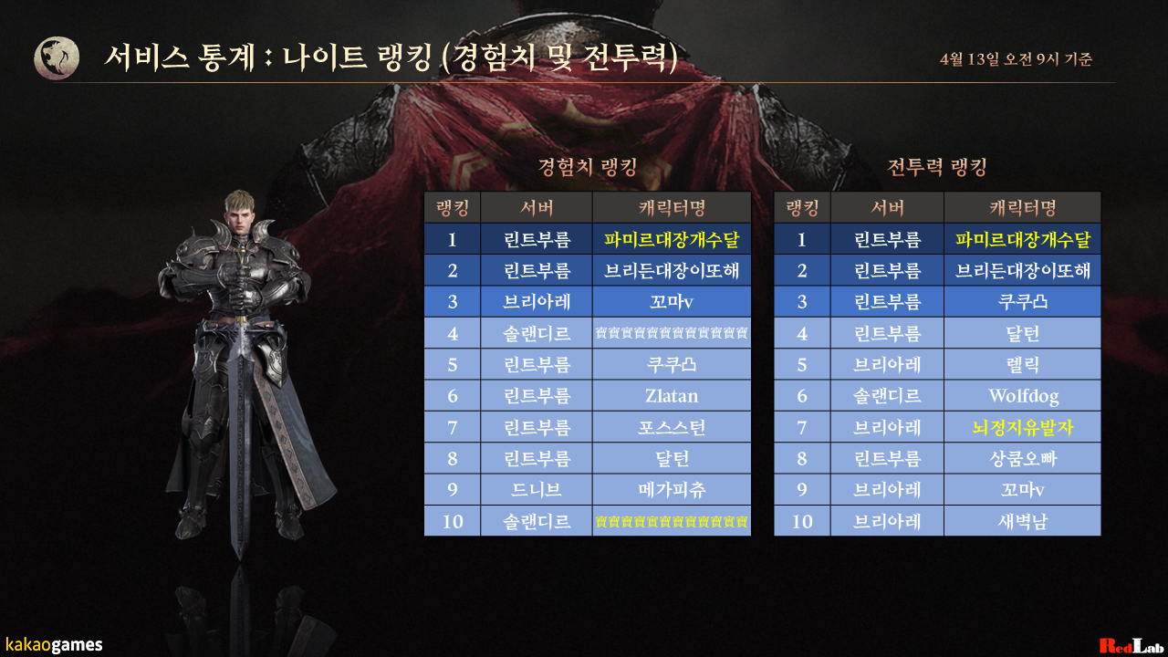 나이트 클래스의 경험치 및 전투력 랭킹입니다.