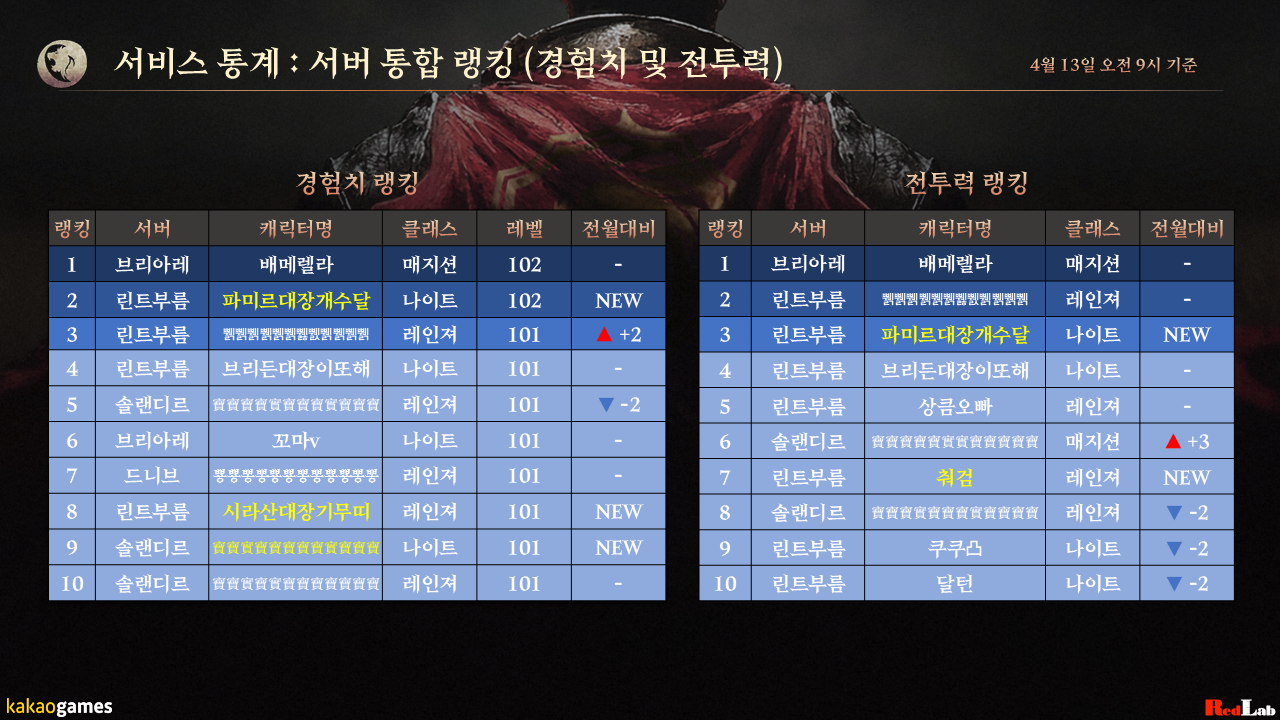 다음은 서버 통합 경험치 및 전투력 랭킹입니다.