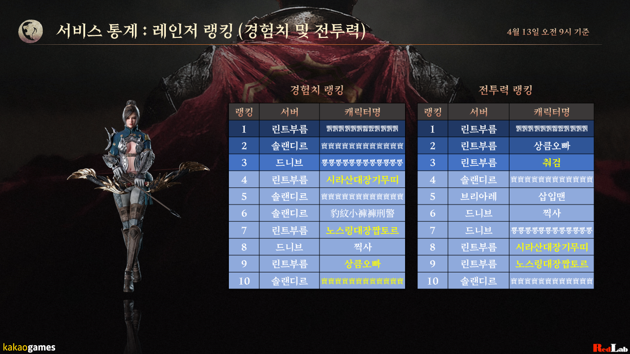 다음으로, 레인저 클래스의 경험치 및 전투력 랭킹입니다.
