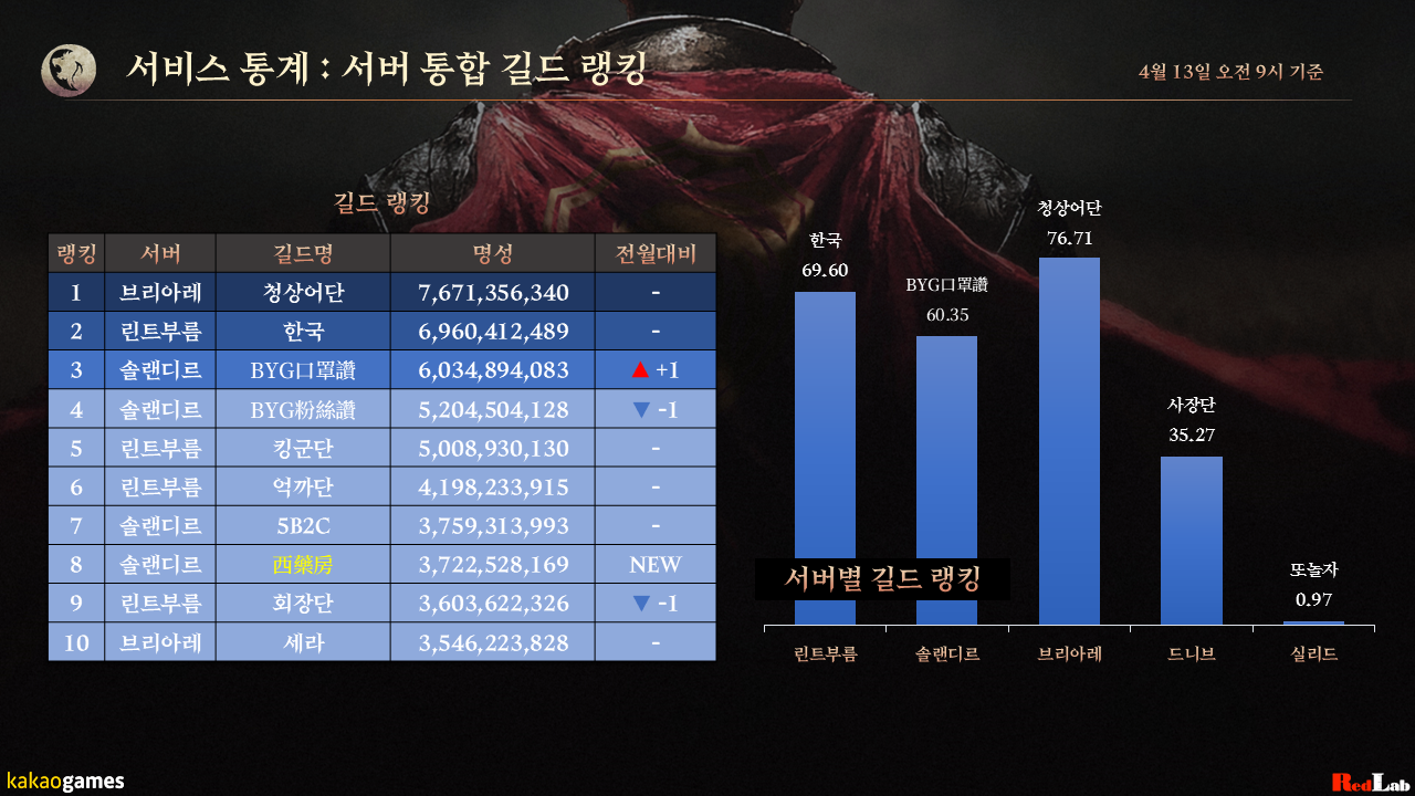 그리고 서버별 길드 랭킹 1위는 우측 표에서 보시는 바와 같습니다.