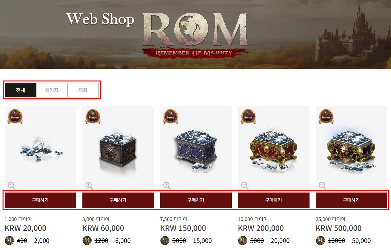 웹 상점의 패키지는게임 내 상점의 패키지와 다른 구성의 상품이 판매되며, 게임 내 패키지와 비교하여 더 많은 보너스 다이아를 제공하고 대량 다이아 구매가 가능해져 더 나은 편의성을 제공해드립니다.
