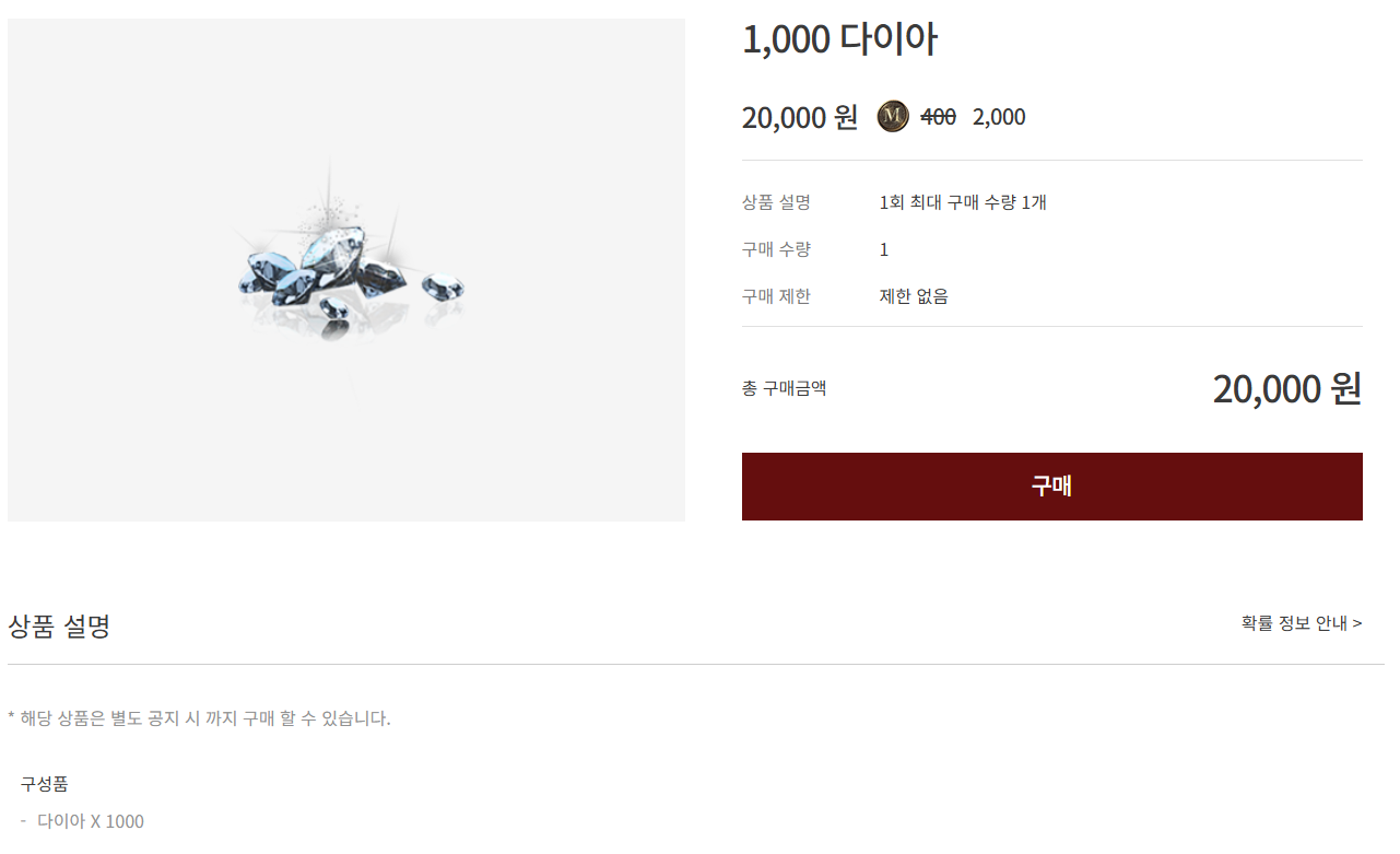 | 1,000 다이아 | 1,000 다이아 2,000 마일리지 | - | |