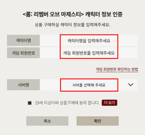 ⑤ 이어서 상품 구매를 시 수령할 캐릭터 및 계정 정보를 입력합니다. 이 때 반드시 캐릭터명, 게임 회원번호, 서버명을 올바르게 입력해 주셔야 정상적으로 상품을 구매할 수 있습니다.