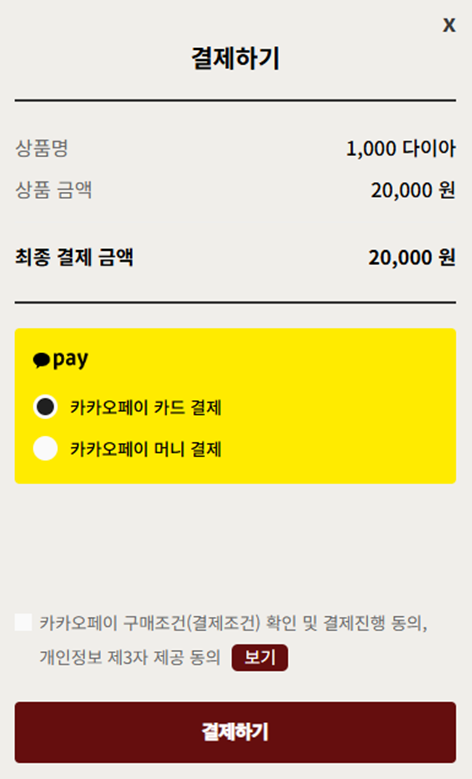 ⑦ 결제 수단은 <카카오페이>가 마련되어 있으며, 원하는 결제수단을 선택 후 [결제하기] 버튼을 눌러 결제를 진행합니다.