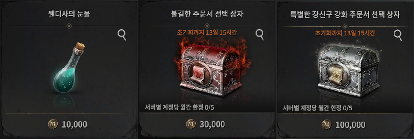 - 영광의 증표 / 기세의 휘장 / 용기의 인장 / 이벤트 강화 주문서 / 라헬의 황금 주화