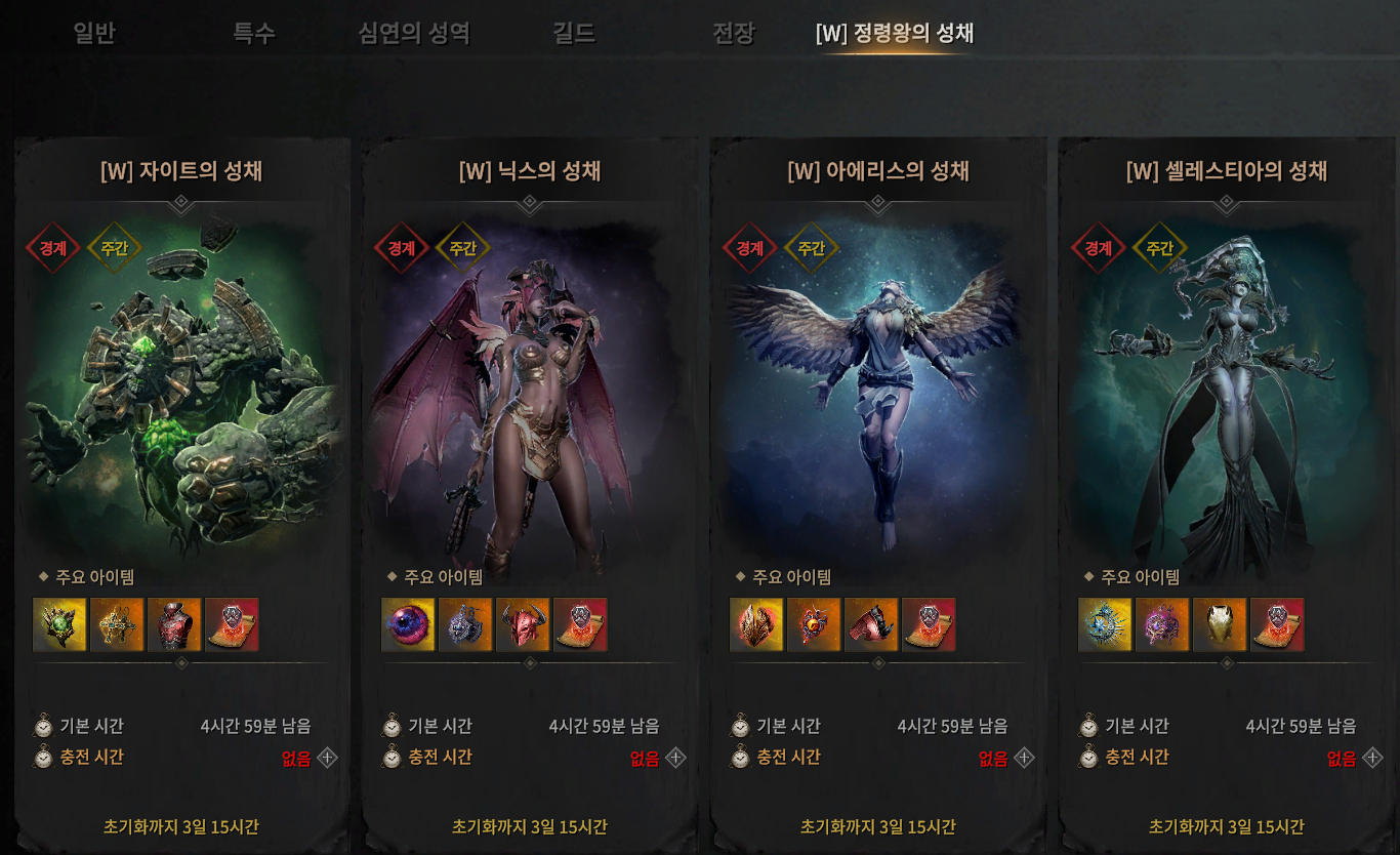 * <정령왕의 성채>의 각 던전은 주말에는 <자이트/닉스/아에리스/셀레스티아의 성채> 던전이 오픈되며, 이후 평일에는 <자이트/닉스/아에리스/셀레스티아의 안식처> 던전으로 변경됩니다.