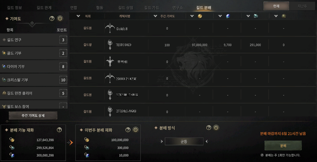 ※ 분배 방식이 기여도이고 길드원 전체의 주간 기여도 합이 0일 경우 분배가 진행되지 않습니다.