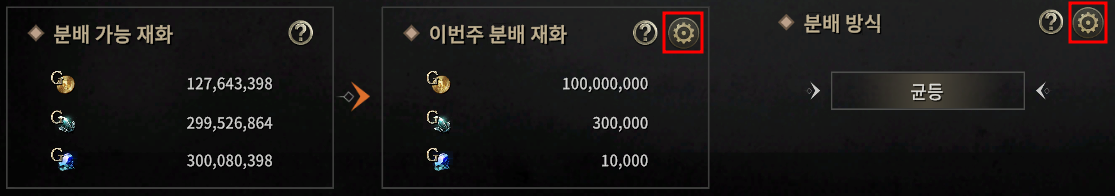 - 화면 하단 [이번 주 분배 재화] 우측 톱니바퀴 아이콘을 눌러 상세 설정 창을 열 수 있습니다.