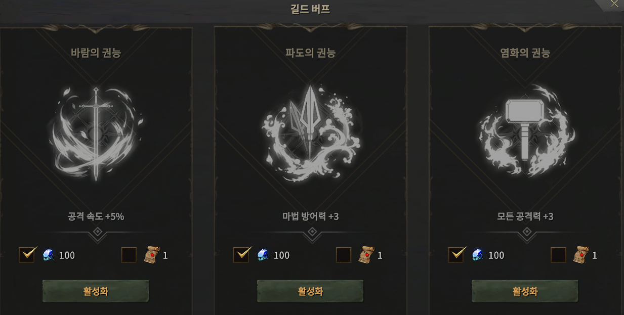 | 4 | 길드 버프 활성화 | 길드원이라면 누구나 길드 버프를 활성화할 수 있습니다. 길드 버프 활성화 시, 길드원 전체에게 해당 버프를 1시간 동안 적용합니다. 길드 버프 활성화에는 100다이아 혹은 길드 버프 티켓이 소모됩니다. |