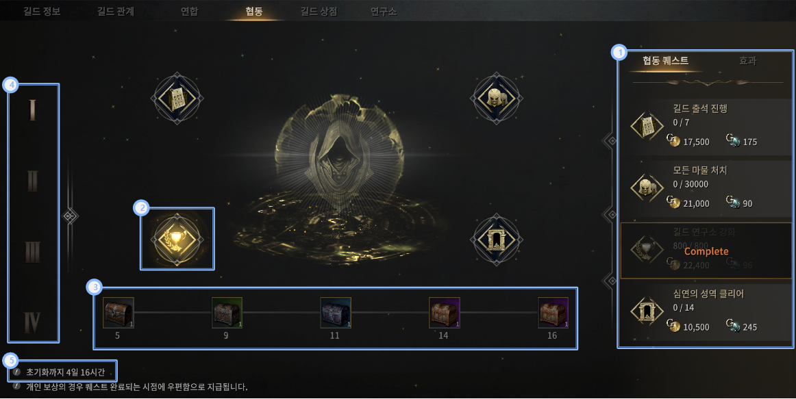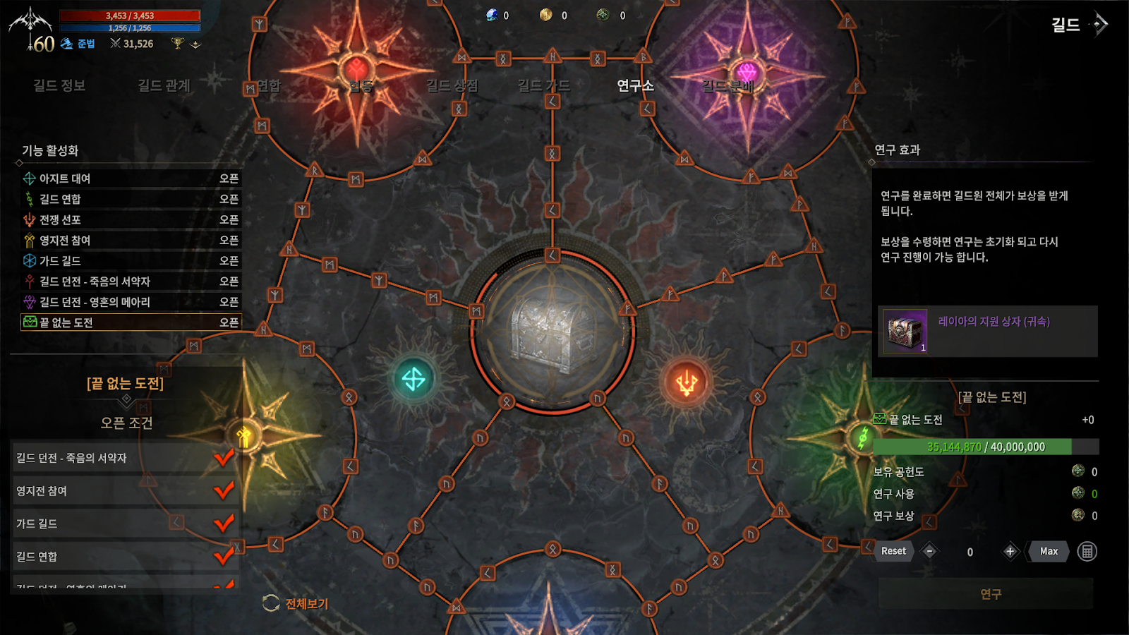 - 모든 연구를 완료한 길드는 [끝 없는 도전] 연구를 통해 길드 협동 퀘스트 ‘길드 연구’ 를 진행할 수 있습니다.