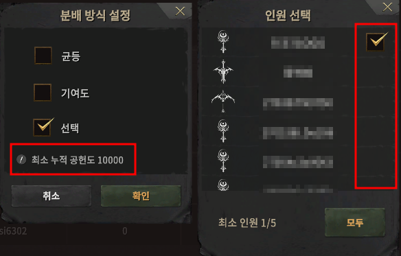 - 선택 분배의 경우 누적 공헌도를 달성한 캐릭터 우측에 체크박스가 활성화되며, 최소 5인 이상을 지정해야만 분배 설정이 완료됩니다.