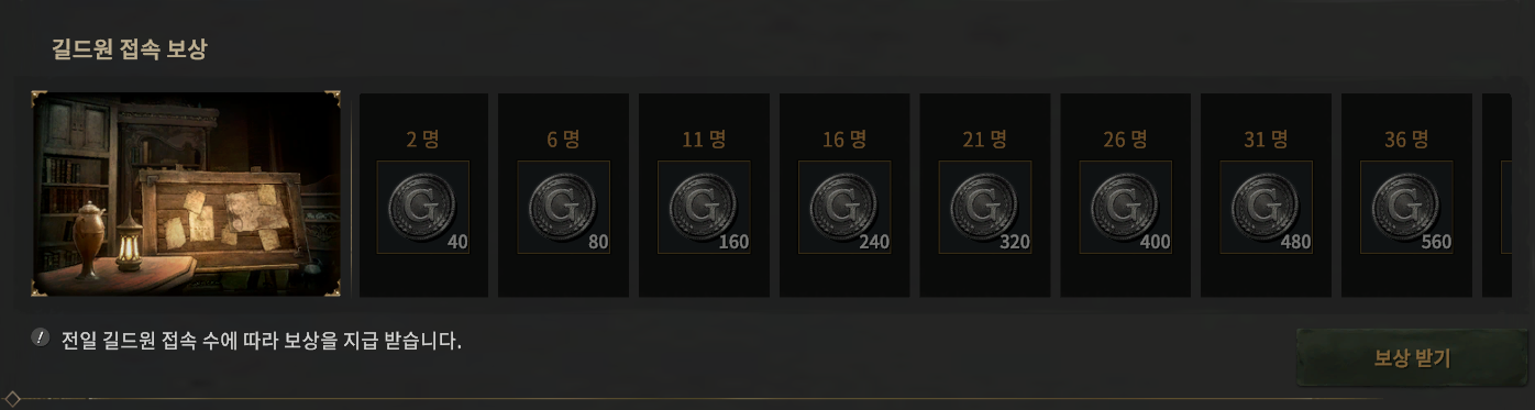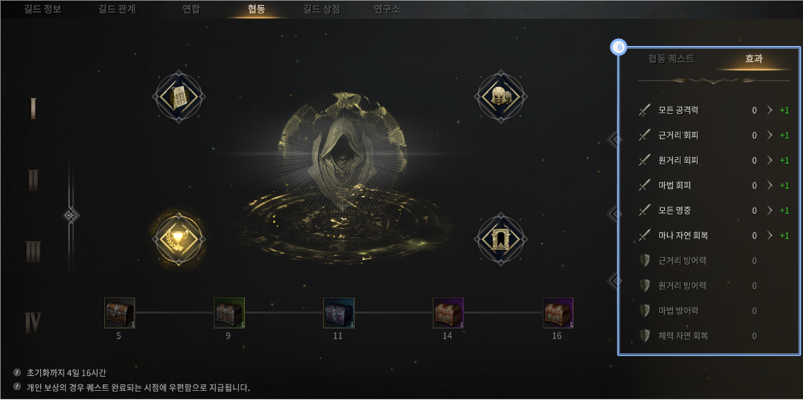 | 6 | 퀘스트 완료 버프 | 길드 퀘스트를 완료한 수에 따라 추가 능력치 버프를 받을 수 있습니다. |