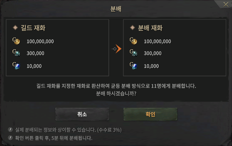 - 분배 확정 시 재화가 실제 분배되기까지 60분이 소요되며 60분이 지나기 전이라면 길드장은 분배를 취소할 수 있습니다.