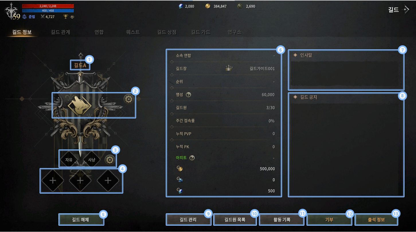 | 8 | 길드 공지 | 길드원이 확인할 수 있는 길드 공지입니다. 길드장, 부길드장이라면 길드 공지 영역을 선택해 길드 공지를 작성/수정할 수 있습니다. |
