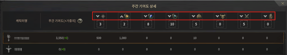 - 기여도 하단의 ‘주간 기여도 상세’ 버튼을 누르면 모든 길드원의 기여도 획득 정보를 확인할 수 있으며, 기여도는 매주 월요일 09:00에 초기화됩니다.