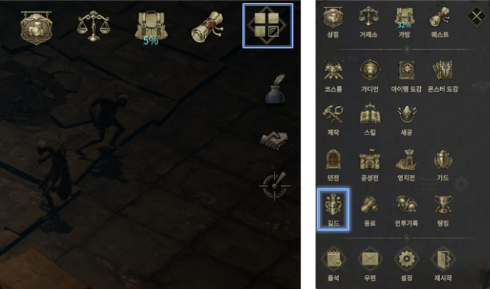- 기본 화면 우측 상단 [메뉴]에서 [길드] 메뉴를 선택하면 길드 UI를 확인할 수 있습니다