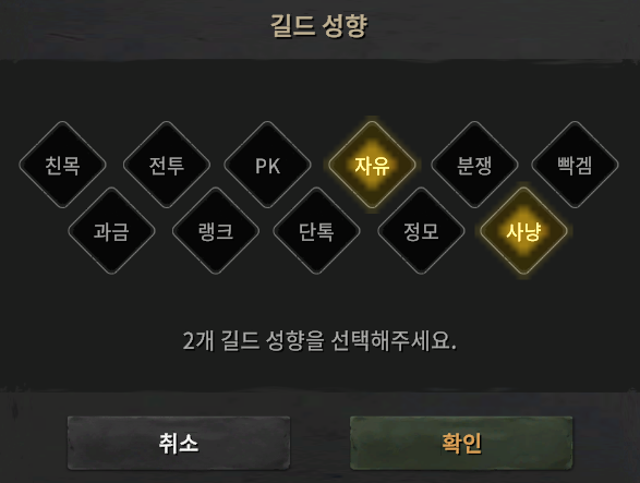 | 3 | 길드 성향 및 설정 | 설정된 길드 성향 2가지를 확인할 수 있습니다. 길드장이라면 우측의 [길드 성향 설정] 아이콘을 선택해 길드 성향 2가지를 선택할 수 있습니다. |