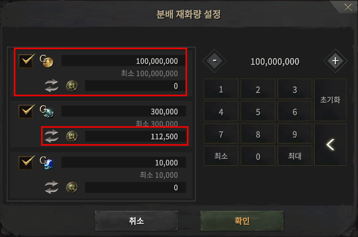 - 길드원에게 분배할 재화를 체크 박스 형식으로 선택하고 재화량을 지정할 수 있습니다.