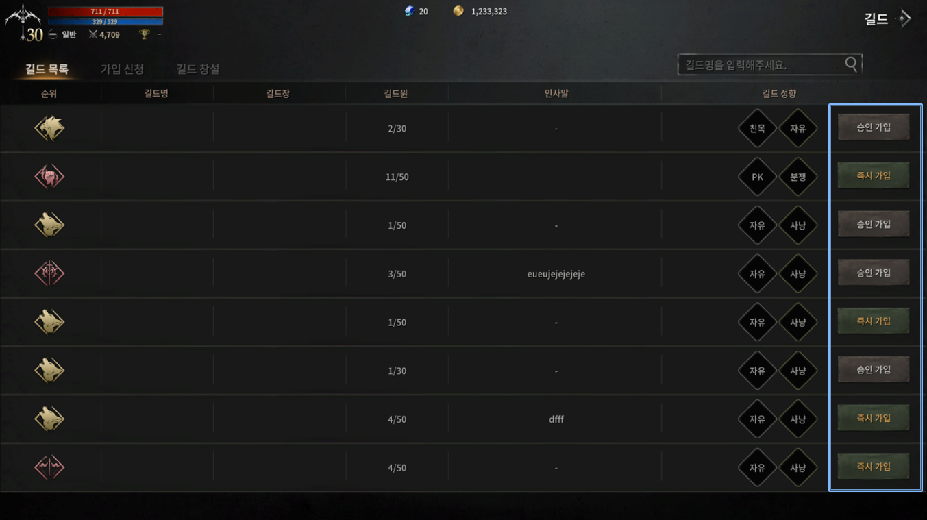 * 길드 가입 방식에는 [즉시 가입]과 [승인 가입]이 있습니다.
