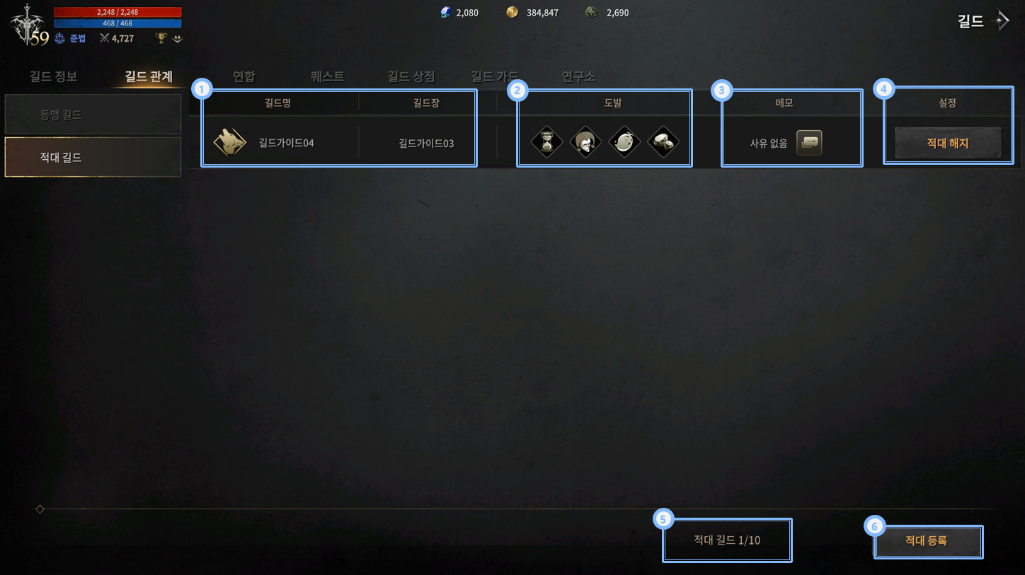 | 5 | 적대 길드 수 | 현재 등록된 적대 길드 수와 최대 등록 가능한 적대 길드 수를 확인할 수 있습니다. |
