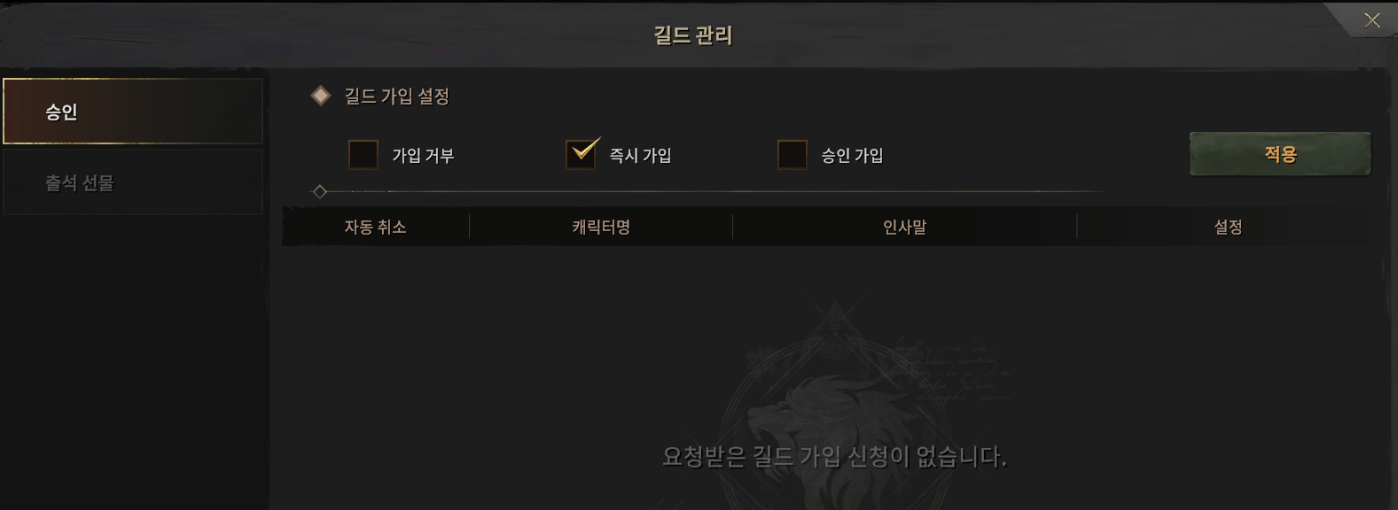 | 9 | 길드 관리 | 길드 가입 방식과 출석 선물을 설정할 수 있습니다. - 길드 가입 방식은 가입 거부, 즉시 가입, 승인 가입 3가지가 있습니다. * 가입 거부: 타 캐릭터는 길드 가입 신청을 보낼 수 없습니다. * 즉시 가입: 승인 절차 없이 가입 요청 즉시, 길드에 가입됩니다. * 승인 가입: 가입 요청 시 길드장/부길드장의 승인을 통해서만 길드에 가입됩니다. ※ 캐릭터는 동시에 최대 5개 길드에 가입 신청할 수 있습니다. ※ 캐릭터 가입 승인 대기 시간은 1시간이 지나면 자동으로 신청이 취소됩니다. - 길드 다이아를 사용하여 출석 선물을 활성화 하면 모든 길드원이 [출석 정보] 메뉴에서 보상을 수령할 수 있습니다. - 출석 선물은 무기 강화 주문서(귀속), 방어구 강화 주문서(귀속), 희귀 세공석(귀속) 3개 중의 하나를 선택하여 활성화할 수 있습니다. - 출석 선물에 대한 자세한 설명은 출석 가이드를 참고할 수 있습니다. |