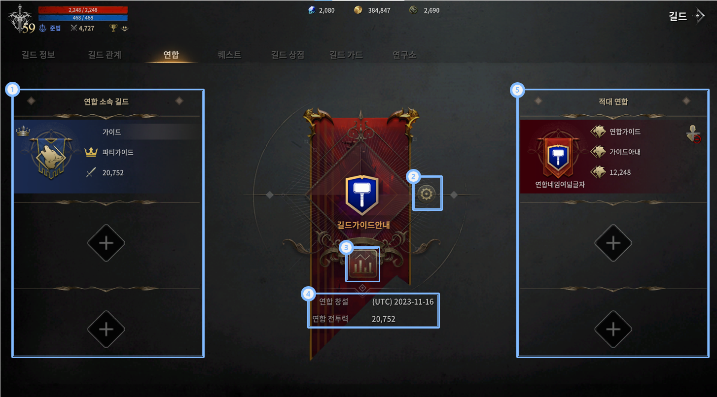 | 1 | 동맹 길드 정보 | 동맹 길드명, 길드장, 인원수, 성향을 확인할 수 있습니다. |