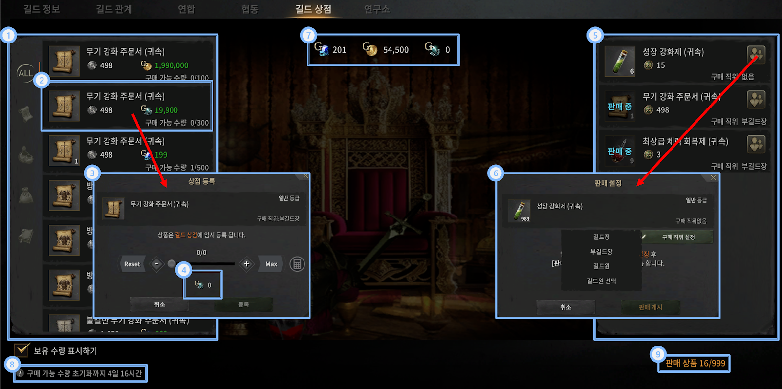 | 9 | 판매 상품 | 길드NPC상점에 등록된 상품의 총합을 나타냅니다. 최대 999개까지 등록할 수 있습니다. |