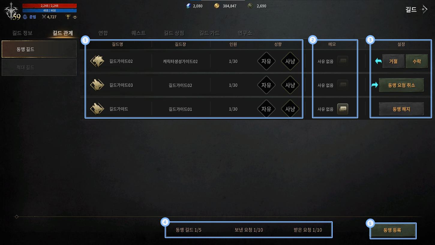 | 4 | 현재 동맹 길드 상태 | 현재 맺은 동맹 길드 수와 진행 중 동맹 요청 수를 확인할 수 있습니다. - 동맹 길드 최대 수: 5개 - 동맹 길드 보내 요청 최대 수: 10개 - 동맹 길드 받은 요청 최대 수: 10개 |
