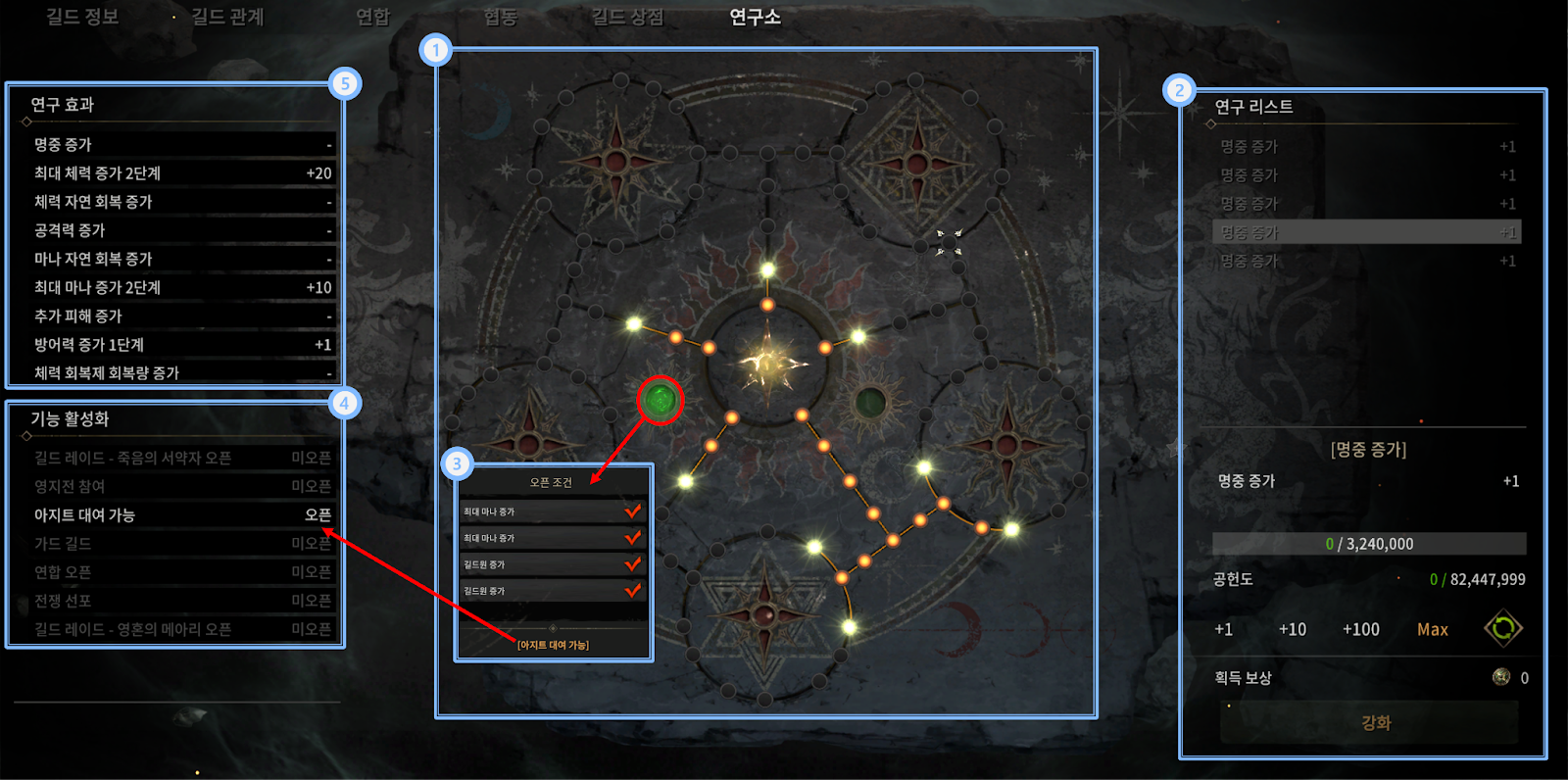 | 4 | 기능 활성화 | 3번의 핵심 연구의 오픈 조건을 만족한 기능은 기능 활성화 리스트에서 ‘오픈’으로 표시되며, 길드 연구의 주요 기능들도 확인할 수 있습니다. |