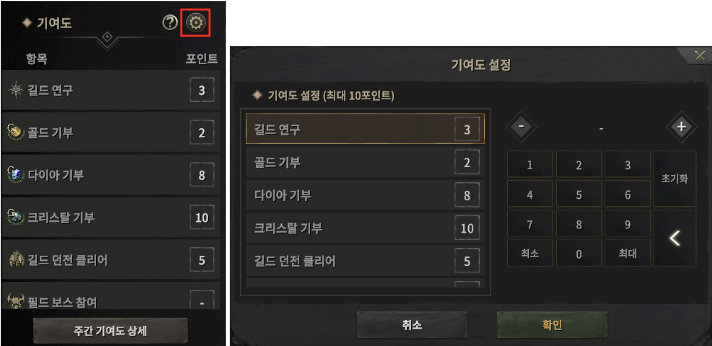 - 길드장은 화면 좌상단의 [기여도] 우측의 톱니바퀴 아이콘을 눌러 기여도 별 획득 포인트를 설정할 수 있습니다.