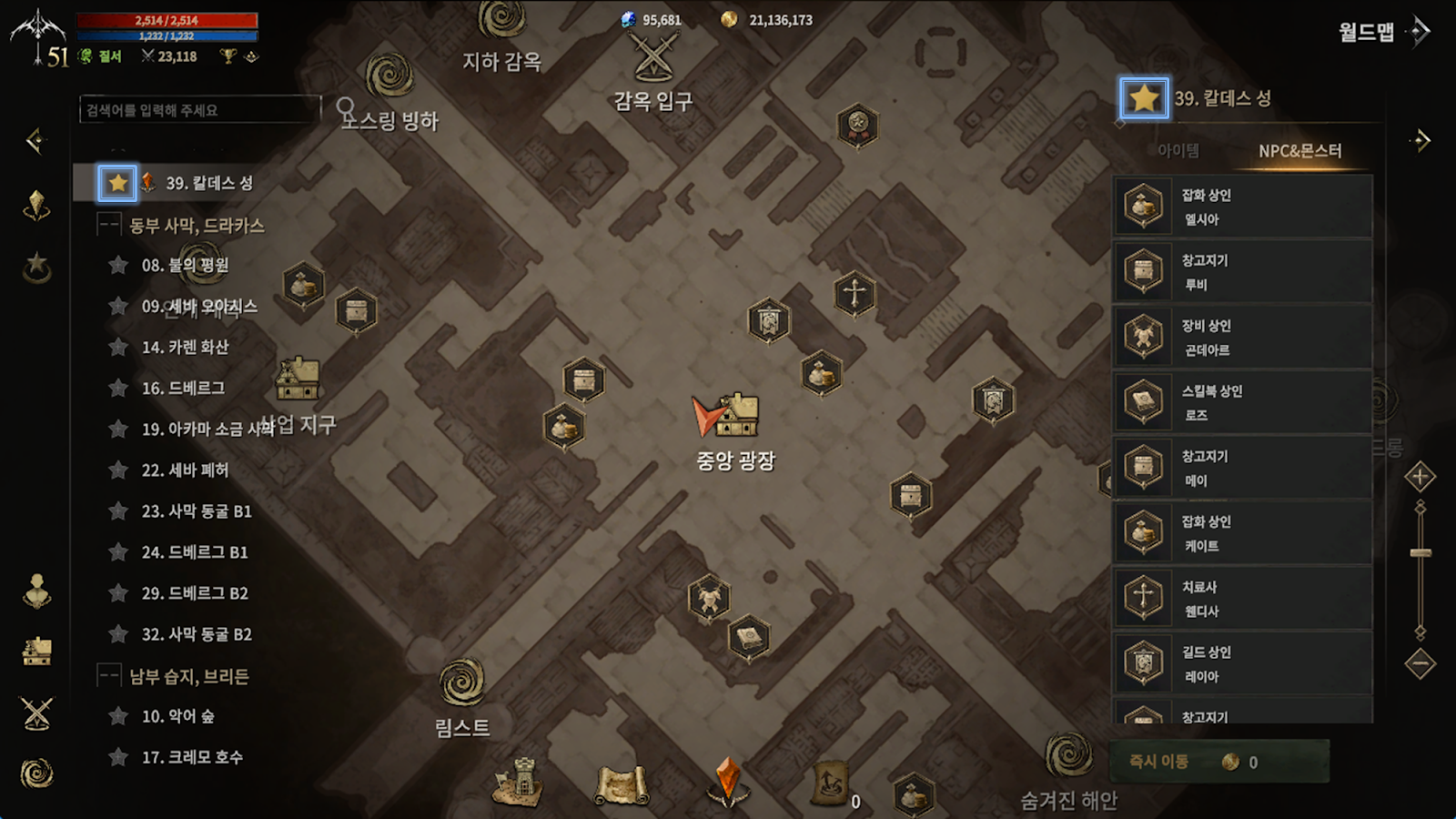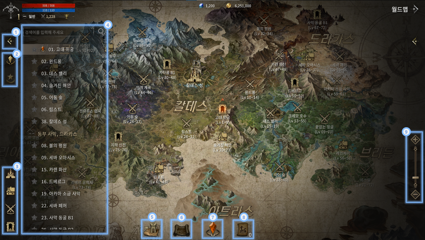 롬의 이야기가 펼쳐지는 칼데라스 대륙의 모든 지역을 확인할 수 있는 지도가 월드맵입니다. 월드맵은 단순히 지도만 보여주는 것이 아닌, 현재 캐릭터의 위치, 해당 지역의 몬스터와 NPC 등의 정보를 확인할 수 있습니다.