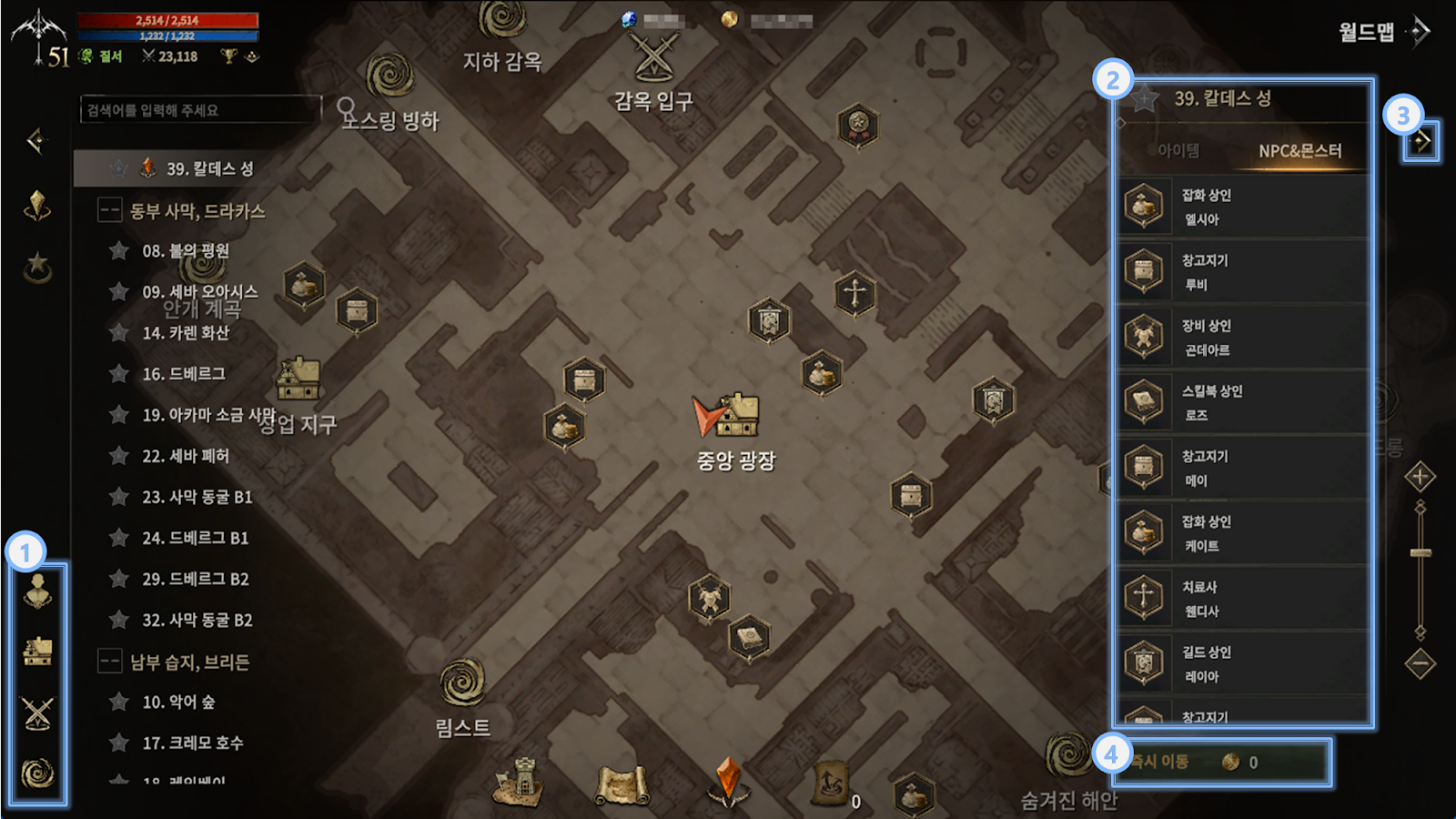 | 4 | 즉시 이동 버튼 | [즉시 이동] 버튼을 선택하면 선택한 지역으로 즉시 이동합니다. 이동 비용은 지역에 따라 다르며, 이동 버튼에 표시되어 있습니다. |