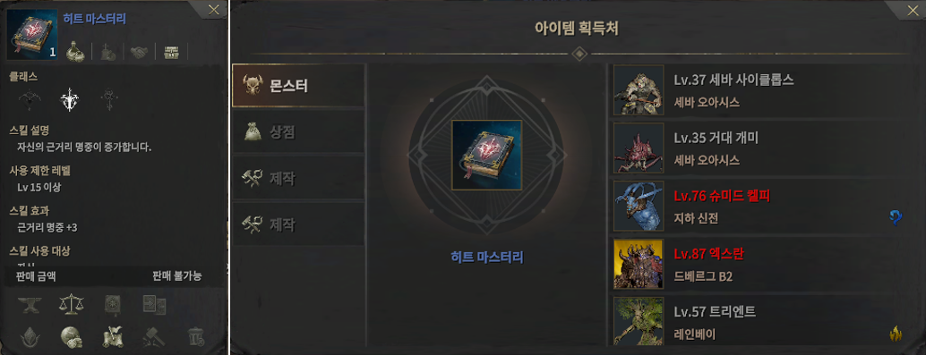 * 해당 목록에서 아이템 아이콘을 선택하면 아이템 상세 정보가, 이름 영역을 선택하면 아이템 획득처 창이 나타납니다.