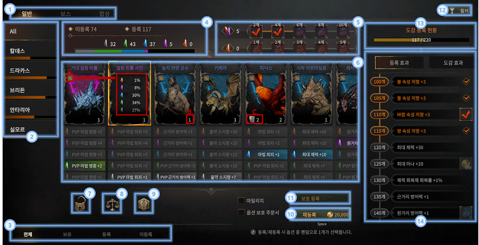 | 6 | 도감 정보 | 몬스터 도감의 명칭, 등급, 몬스터 석판 보유 수량, 부여된 옵션의 등급을 확인할 수 있습니다. A. [%] 아이콘을 선택하면 도감 등록 옵션의 획득 확률을 확인할 수 있습니다. B. 보유 중인 미등록 몬스터 석판의 수량을 확인할 수 있습니다. C. 가방에 보유 중인 몬스터 봉인 석판의 수량을 확인할 수 있습니다. |