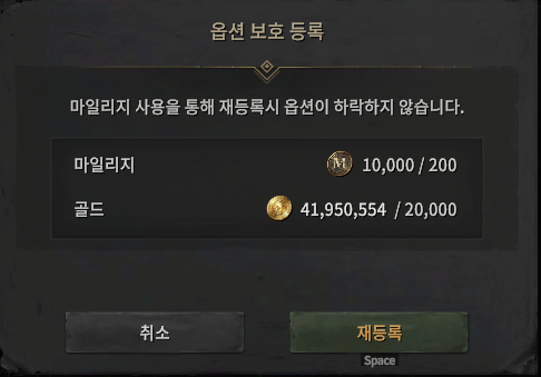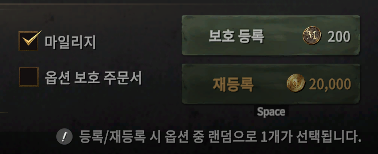 - 옵션 보호 등록 기능 이용 시 [마일리지] 혹은 [옵션 보호 주문서]가 소모됩니다. [마일리지], [옵션 보호 주문서] 소모량은 등급마다 다르게 설정되어 있습니다.