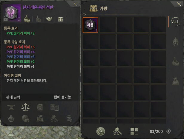| 6 | 옵션 잠금 설정 | 왼쪽 부터 [전체], [잠금], [비잠금] 3가지 중에 하나를 선택할 수 있습니다. - [ALL]을 선택하면 모든 석판중에서 가장 낮은 옵션 등급부터 합성 재료로 등록됩니다. - [잠금]을 선택하면 옵션이 잠금 상태인 석판 중에서 가장 낮은 옵션 등급부터 합성 재료로 등록됩니다. - [미잠금]을 선택하면 옵션이 미잠금 상태인 석판 중에서 가장 낮은 옵션 등급부터 합성 재료로 등록됩니다. |