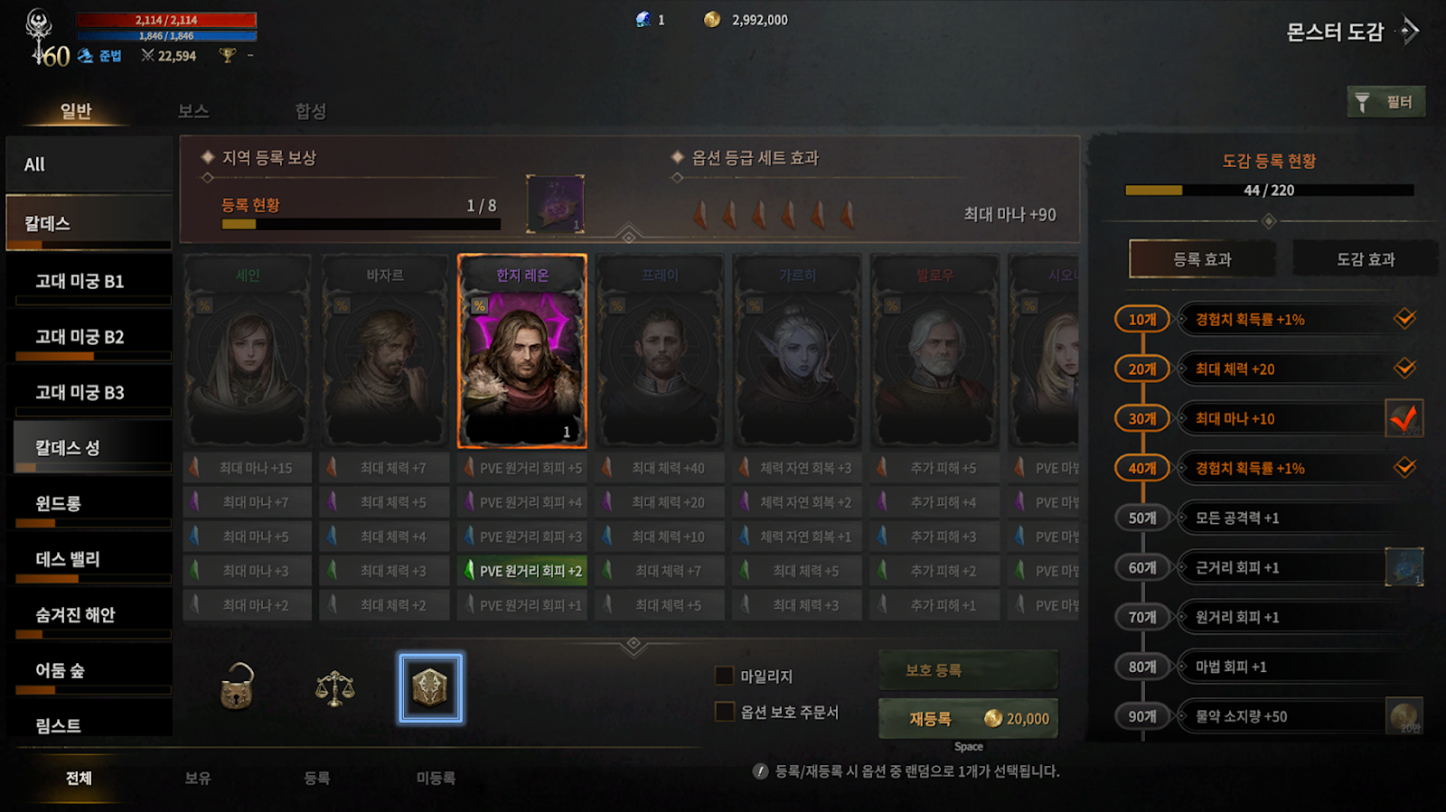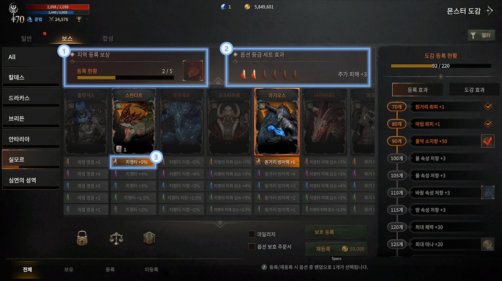 | 2 | 옵션 등급 세트 효과 | 해당 지역의 몬스터 도감의 옵션을 모두 지정된 등급으로 등록하면, 옵션 등급 세트 효과가 부여됩니다. |