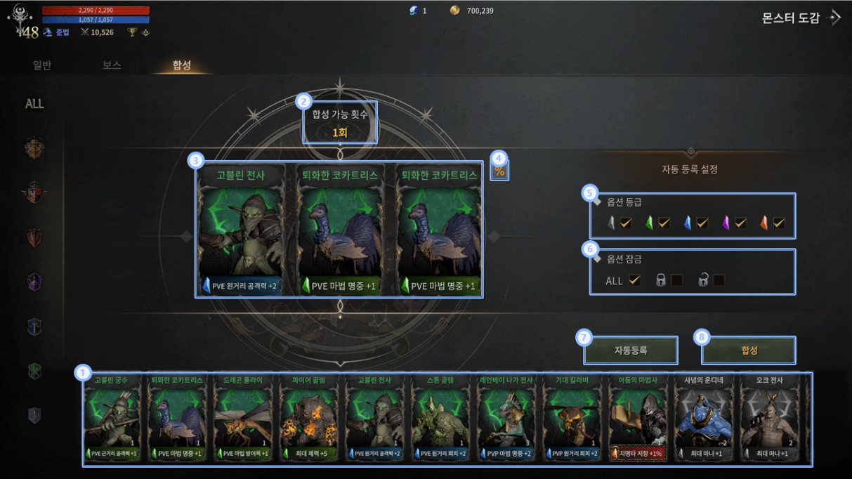 | 5 | 옵션 등급 선택 | 자동등록 시 합성 재료로 사용할 몬스터 석판 옵션 등급을 지정할 수 있습니다. 특정 옵션 등급을 선택 해제할 경우 해당 옵션 등급의 석판은 자동등록 시 합성 재료로 이용되지 않습니다. - 옵션 등급 왼쪽부터 일반, 고급, 희귀, 영웅, 전설 옵션 등급입니다. |