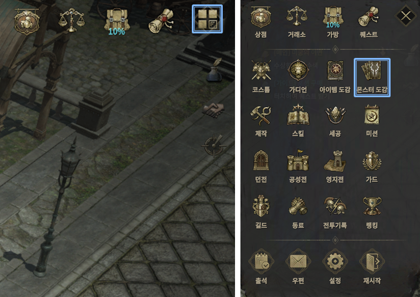 - 게임 화면의 우상단 [메뉴]에서 [몬스터 도감] 메뉴를 선택하면 몬스터 도감 UI를 확인할 수 있습니다.