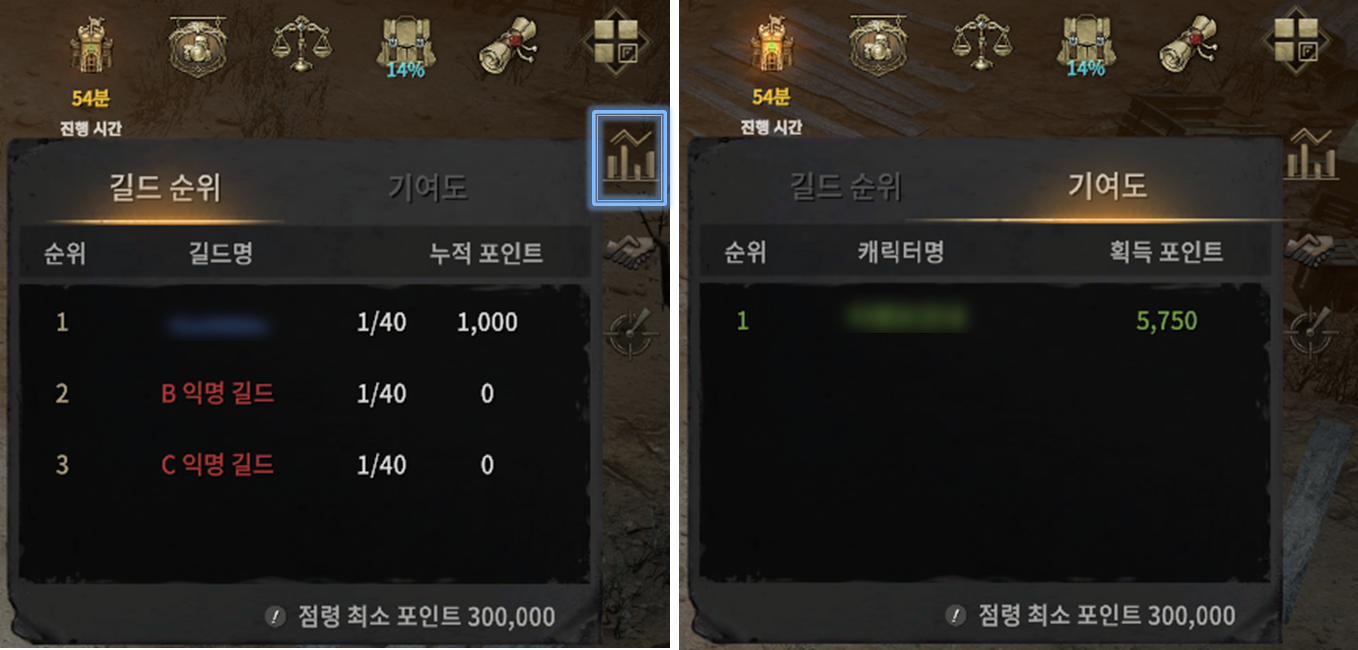 - 영지전 참여시 우측 상단에 노출되는 그래프 아이콘을 선택하면 영지전에 참여한 길드의 점령 포인트 정보와 소속 길드, 자신, 연합원들의 기여도 순위를 확인할 수 있습니다.