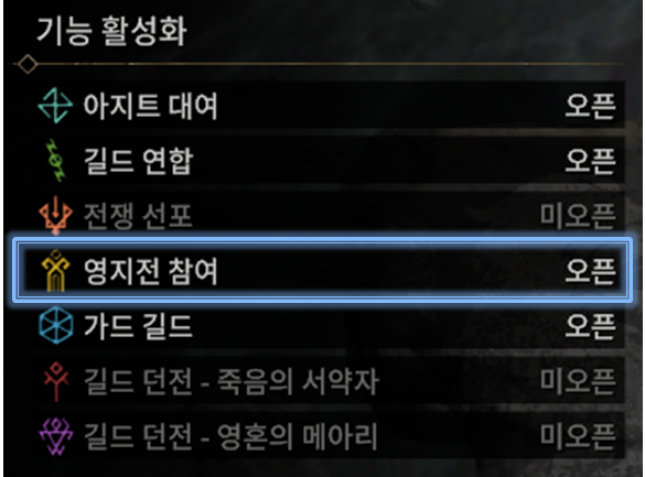 ※ 영지전 신청에 성공한 길드와 같은 연합 소속 길드는 [영지전 참여] 연구를 활성화하지 않더라도 참여할 수 있습니다.