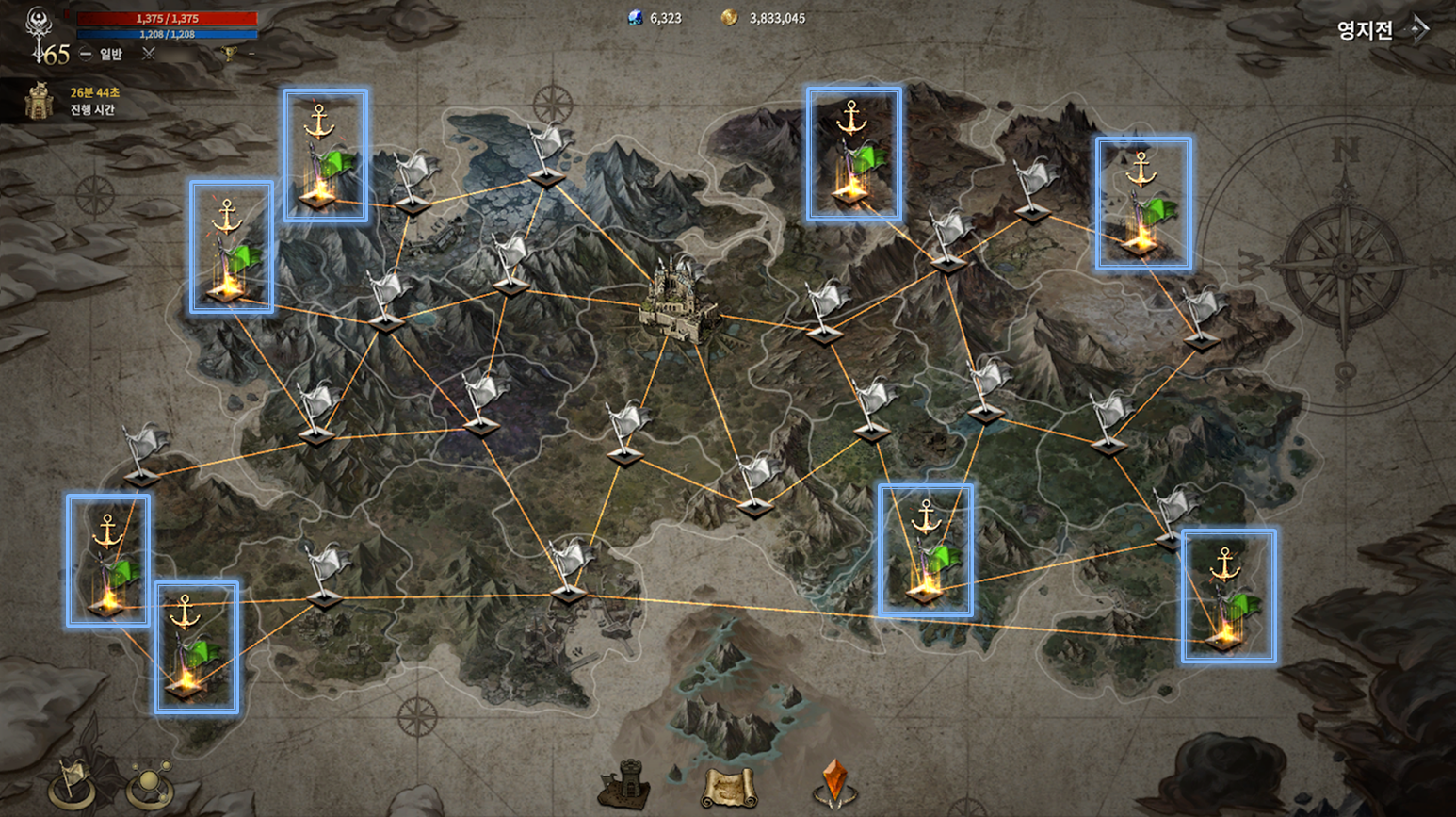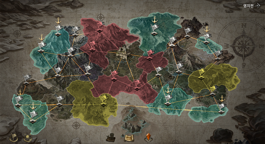 - 영지를 점령하고 있지 않은 길드는 닻 아이콘이 표시된 8개의 시작 영지에만 영지전 참여 신청이 가능합니다.